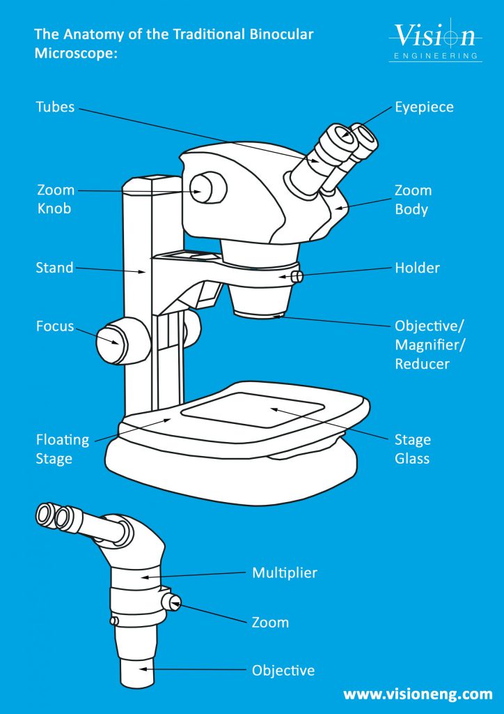 A useful diagram outlining the components that make up a traditional stereo microscope.