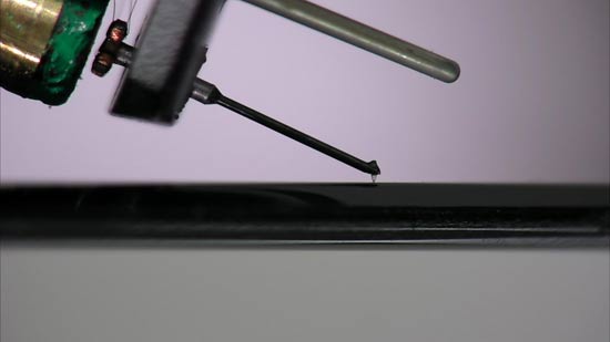 The stylus tip consists of a micro diamond which is what interfaces with the record and tracks the groove on the record as it rotates. The micro diamond needs to be absolutely symmetrical so that it sits within the V-groove properly ensuring sound is distributed equally through both channels. Rega manufactures an average of 2,000 cartridges per month and each has to touch the vinyl with a perfectly symmetrical micro diamond for precision audio – as shown below.